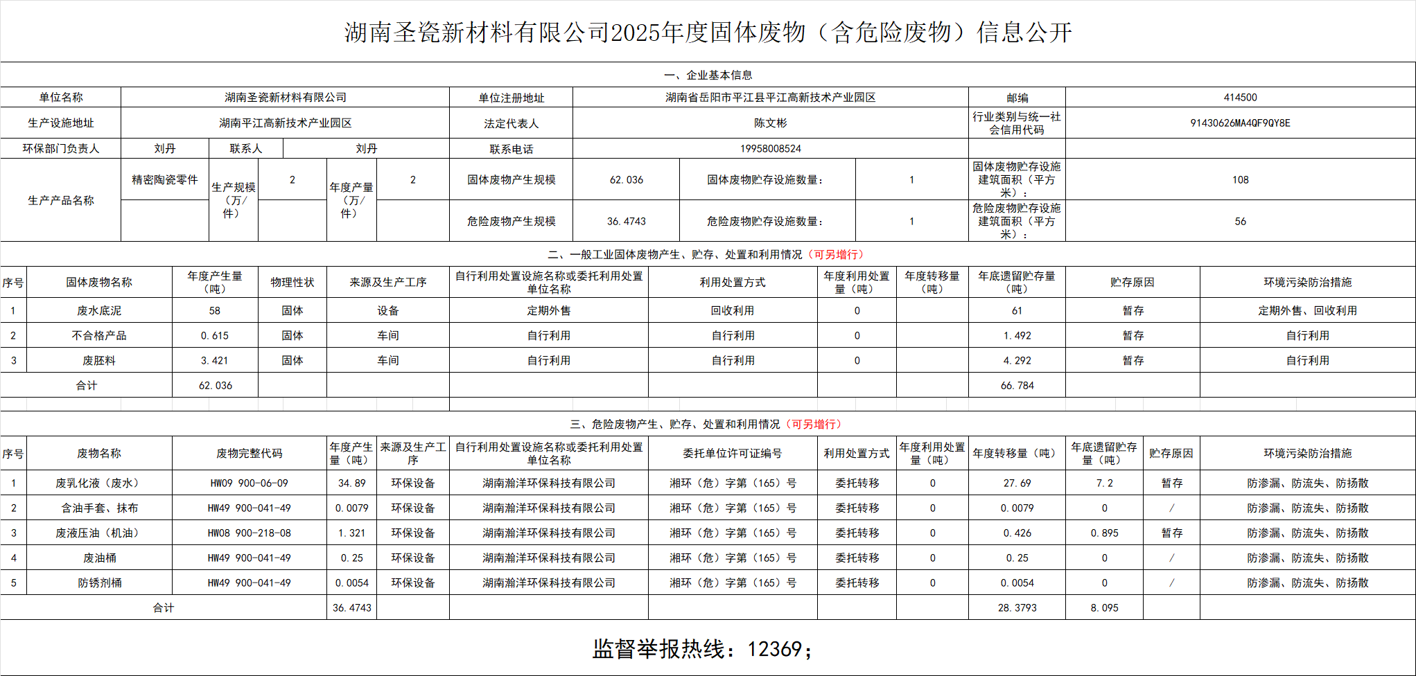 湖南圣瓷新材料有限公司2025年度固体废物(含危险废物)信息公开